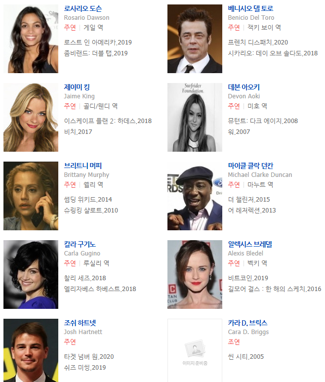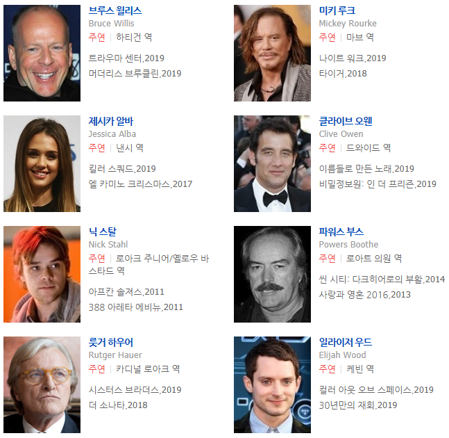 무지막지한 라인업이다 나열하자면 지금은 묶을래야 묶을 수도 없다. 조셉 고든 레빗, 제시카 알바, 브루스 윌리스, 레이디 가가, 조슈 브롤린, 에바 그린 등 수 많은 감초같은 배우들이 여기저기서 튀어 나온다. 여러 이야기가 동시에 병렬적으로 전개되며 결국 하나로 이야기가 연결되는 영화는 선한 역할이 무너지기도 하지만 나쁜 역할도 철저히 응징 당하는 선혈이 낭자한 영화라고 볼 수 있다.정교한 스토리라기 보다는 독특한 연출과 뛰어난 배우들이 그의 만화를 기념하는 상징적인 작품으로 이해할 수 있다. 다음에 기회가 되면 프랭크 밀러의 다양한 만화를 원작으로 한 영화들을 리뷰해 보도록 하겠다.