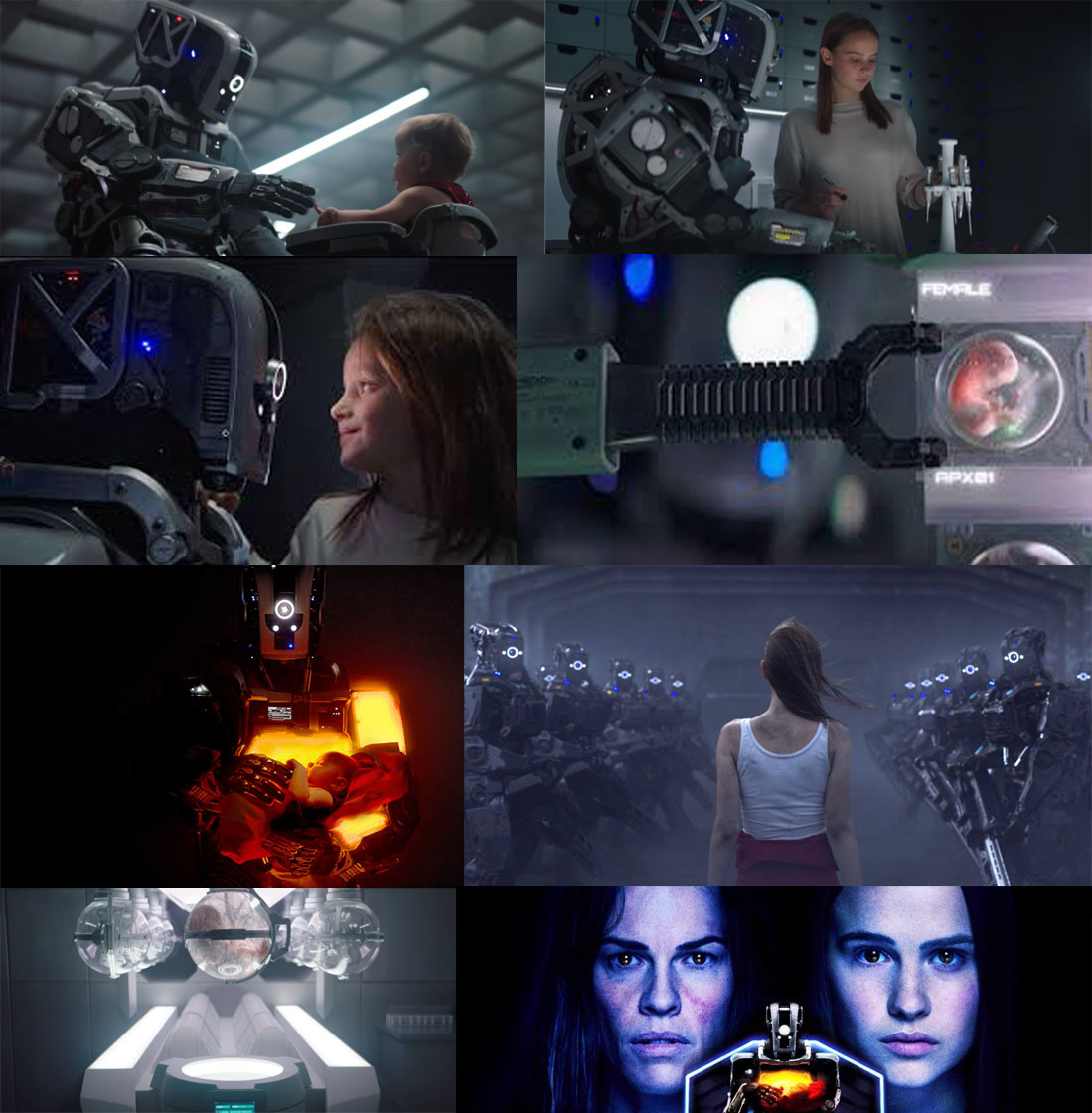 신예들의 향연이다. 감독은 그랜트 스퍼토어로 이번 영화가 입뽕작이다. 장편 영화에 대한 필모그래피가 전무하지만 예상되는 흐름에도 불구하고 호기심을 불러일으키는 연출을 적당히(?) 했다고 보여진다. 적어도 기본적 스릴감이 떨어진다는 느낌은 적다. 주연으론 생소한 클라라 루가드로 2013년 데뷔한 어린배우다. 로봇트의 목소리를 연기한 ‘로즈 번’은 수 많은 액스맨 시리즈와 우리에게 유명한 좀비영화 28주후와 같은 영화에서 주연으로 활약했다. 비록 로보트지만 미묘하게 드러나는 감정과 말투는 로보트인지 아닌지에 대한 혼란을 불러 일으킬 만한 훌륭한 연기라고 생각한다. 그리고 마지막으로 누구나 한번쯤 봤을 익숙한 배우 ‘힐러리 스웽크’의 출연이다. 그녀는 최근 문제작 ‘헌트’와 2005년 여우주연상을 안겨준 ‘밀리언 달러 베이비’ (인생작품이다 꼭 한번 봐라. 클린트 이스트우드 감독은 이제 거장이라고 불러도 무방하지 않나?)까지 30 여편의 영화에서 주조연을 맡으며 혼자서도 극을 이끌어내는 카리스마를 가진 배우이다. 이렇게 두명의 배테랑은 한명의 신예를 떠받치며 영화를 탄탄하게 만든다.