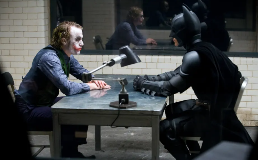 사실 완전한 테칼코마니적인 위치에 있는 조커를 보고 있자면 둘은 크게 다르지 않음을 알 수 있다. 이에는 여러가지 단서가 있다. 첫 장면에서 조커와 배트맨은 자신의 복제들을 정리해 비슷한 방식으로 정리해 나간다. 조커는 제로썸 게임을 통해서 서로를 죽이게 만들어 결국 혼란의 최종 생존자로