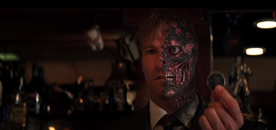 그것은 무정부주의 같은 혼란에 대해 말하는 본질적인 질문이다. 혼란은 그 자체로 원칙과 기준이 없다. 가치관을 기준으로 무엇을 판단한다든지, 선과 악을 가를 필요도 없다. 그것이 기반이 되어 이렇게 묻는 것이다. “판단할 필요가 없는데 뭐가 그리 심각해? “라고 말하는 것이다. 이런 사상에 젖어 들어 버린 대표적인 캐릭터가 “하비 덴트”다. 그의 신념이 새겨진 양쪽이 같은 동전은 조커에 의해 훼손되어 어느 면이 나와도 상관없어지는 즉, 기준이 무너지는 양상을 보여준다.